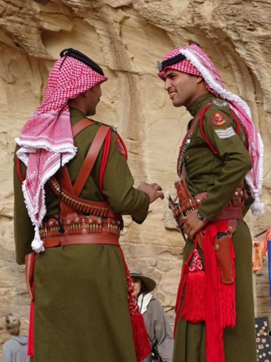 Under the British mandate, there were two patterned keffiyeh designs in use. British Lieutenant-General Sir John Bagot Glubb aka Glubb Pasha designed these patterns for the keffiyehs in the uniforms of his Desert Legion: A black check design and a red check design, used to differentiate between his Palestinian (black) and Jordanian (red) soldiers. Like other pieces of British army uniforms, the “Palestinian” keffiyehs that Glubb’s soldiers wore were made in British textile factories, not in Palestine. Despite being neither widely worn nor culturally specific, nor even geographically sourced, the designs conceived by an English colonialist and produced in England have gained popularity in recent decades and are retroactively conceived as symbolizing Arab Palestinian continuity in the Levant.